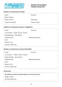 RÉSERVATION CAMPS DE JOUR Vous êtes sur le point de réserver notre formule Camps de jour !Suivez les instructions pour effectuez votre paiement et finaliser votre réservation.Un e-mail de confirmation vous sera envoyé. PENSEZ À VÉRIFIER DANS VOS SPAMS. Merci de télécharger, compléter et nous renvoyer ce formulaire complet à l'adresse info@fluosports.com Télécharger le formulaire en pdf